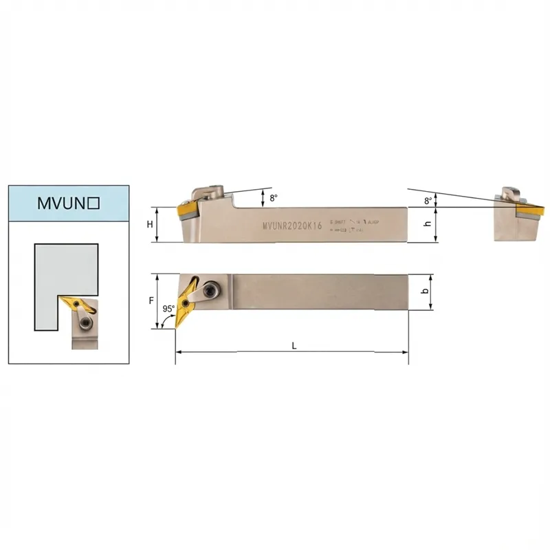 Die MVUNR/L-Serie ist ein Hochleistungs-Außendrehwerkzeughalter, der für maximale Vielseitigkeit beim CNC-Profilieren entwickelt wurde. Der MVUNR zeichnet sich durch seinen spezifischen Eintrittswinkel von 95° aus und bietet einen ausgezeichneten Freiraum für Plandrehoperationen, während er gleichzeitig die Möglichkeit bietet, komplexe Konturen zu zeichnen. Diese Geometrie leitet die Schnittkräfte effektiv entlang der Achse und gewährleistet eine stabile Bearbeitung verschiedener Werkstückmaterialien.