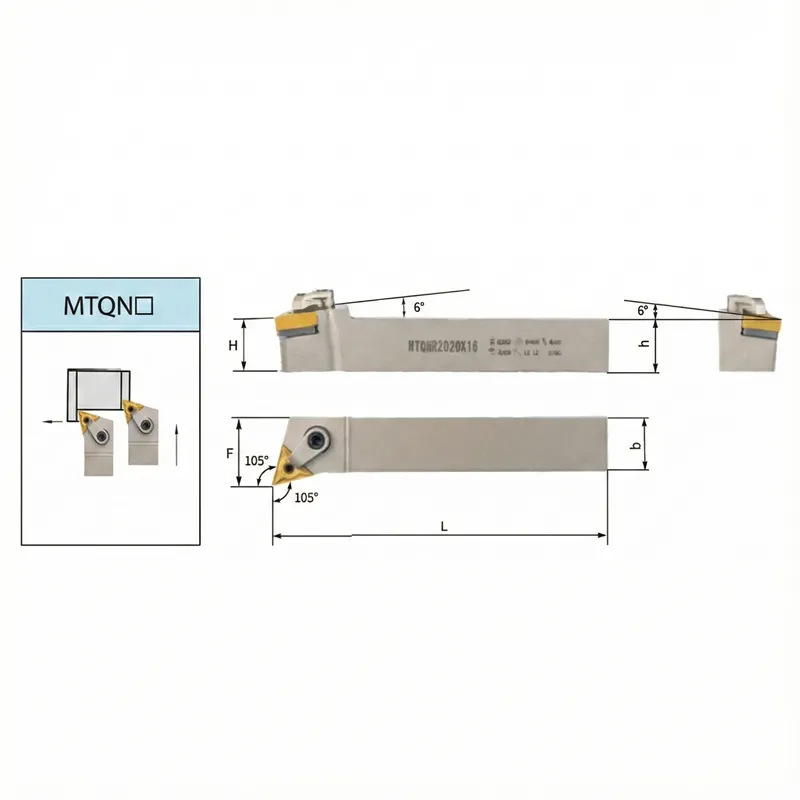 Ce porte-outil est conçu pour accueillir des plaquettes TNMG (Triangle). La combinaison de la plaquette économique à 6 arêtes et de la géométrie à 105° le rend parfait pour les applications de tournage de copies (profilage) où l'outil doit parcourir des contours descendants ou créer des rainures de relief sans interférence avec le corps de l'outil.