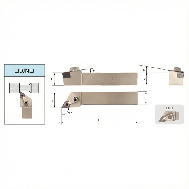 MDJNR/Lツールホルダーは、独自の93度ジオメトリーにより、プロフェッショナルCNC旋削ツールホルダーの中でも際立っています。この特殊なアプローチ角により、工具とワークの間のわずかなクリアランスを維持しながら、縦旋削とフェーシングの両方の加工を行うことができます。この設計により、振動のリスクが大幅に低減され、様々な合金鋼の優れた表面仕上げを実現する旋盤用ツールホルダーとして好まれています。.