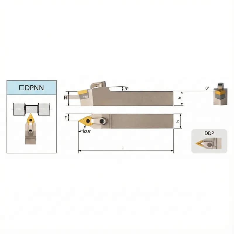 The MDPNN tool holder represents a specialized category within CNC turning tool holder types. Its 62.5-degree approach angle is strategically engineered for operations where standard 93° holders might cause interference. As a neutral lathe turning tool holder, it allows for symmetrical cutting performance, making it the ideal choice for tapering, chamfering, and specific profiling geometries.